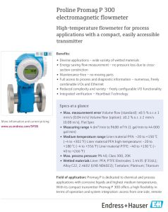 Endress+Hauser Proline Promag P 300 یکی از پیشرفتهترین فلومترهای الکترومغناطیسی (Magnetic Flowmeter) است که برای اندازهگیری دقیق جریان سیالات رسانا در صنایع مختلف طراحی شده است.